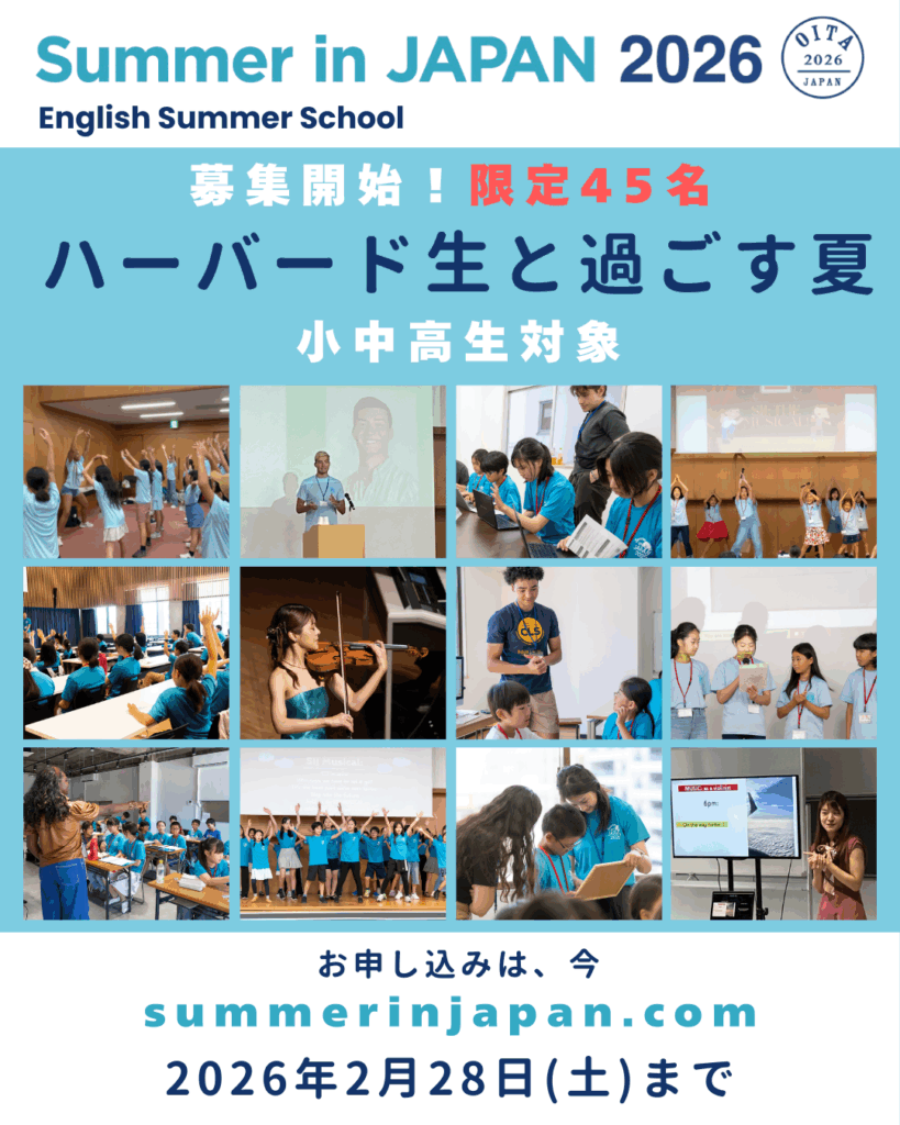 【限定45名】募集開始!ハーバード生と過ごす日本の夏 SIJ 2026 🇯🇵 2026年1月12日 (2026年1月9日) 投稿者: %s Summer in JAPAN 14年の信頼と実績。大分市にて、小中高生がハーバード生から直接指導を受ける特別な夏の8日間。 🗣️選べる3つのワークショップ:①コンピュータ・サイエンス②パフォーミング・アーツ③パブリック・スピーキング 🔤英語力強化:「 […] 続きを読む… from 【限定45名】募集開始!ハーバード生と過ごす日本の夏 SIJ 2026 🇯🇵