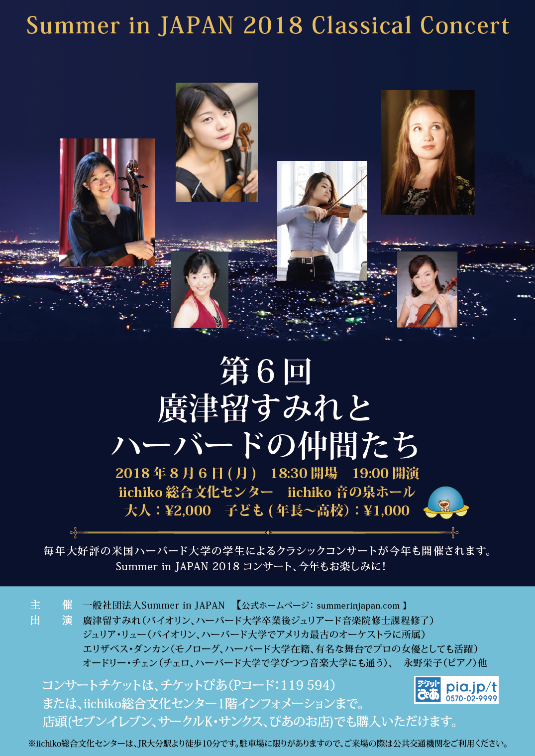 国際コンクール優勝経験のある大分市出身のバイオリニ スト、廣津留すみれを中心に、全米最古のオーケストラであ るハーバード・ラドクリフ・オーケストラのメンバー、カール・ ロジャーズ、分子生物学とピアノの両立に励むジェイソン・ リーなどハーバード大学の学生たちが奏でるクラシックの夕べ。勉強だけではなく、芸術における自己表現を子どもたちに伝えます。