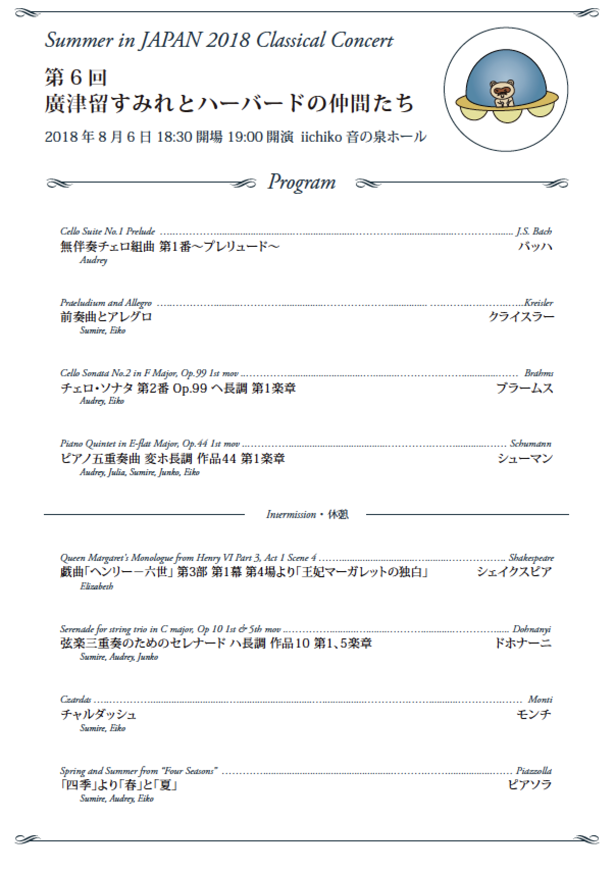 | 出演者 | 廣津留すみれ(バイオリン、ハーバード大学から ジュリアード音楽院修士課程) ドミニク・キム (フルート、ハーバード大学とニュー イングランド音楽院修士課程を両立中) アンディ・トロスカ (テノール、ハーバード大学のオペラソサエティやコーラスで大活躍) スティーブ・クニス(俳優、ハーバード大学内のプロダクションで演出家としても活躍中) マックス・マギリヴレイ(俳優、1770年創立の歴史あるプロダクション、Hasty Pudding Theatricalsで活躍中 ) 今村順子 (ビオラ)、関原弘二 (チェロ)、 永野栄子 (ピアノ)、他 |