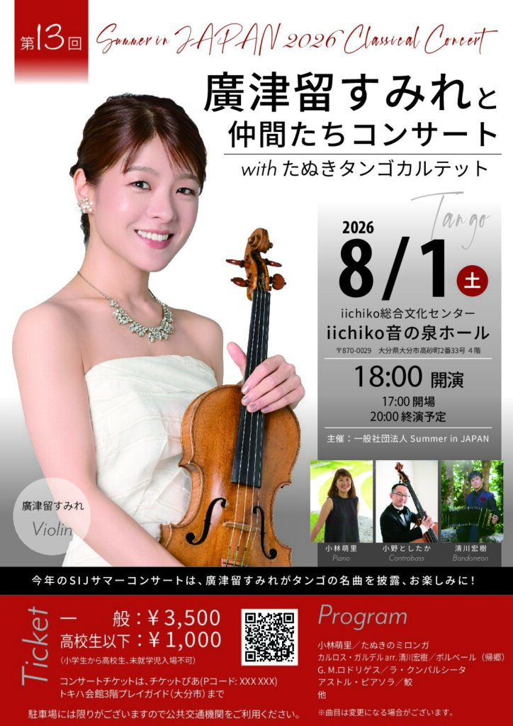 This year’s SIJ Summer Concert features SIJ Co-founder and world-renowned violinist Sumire Hirotsuru, performing alongside the “Tanuki Tango Quartet”!🎻✨